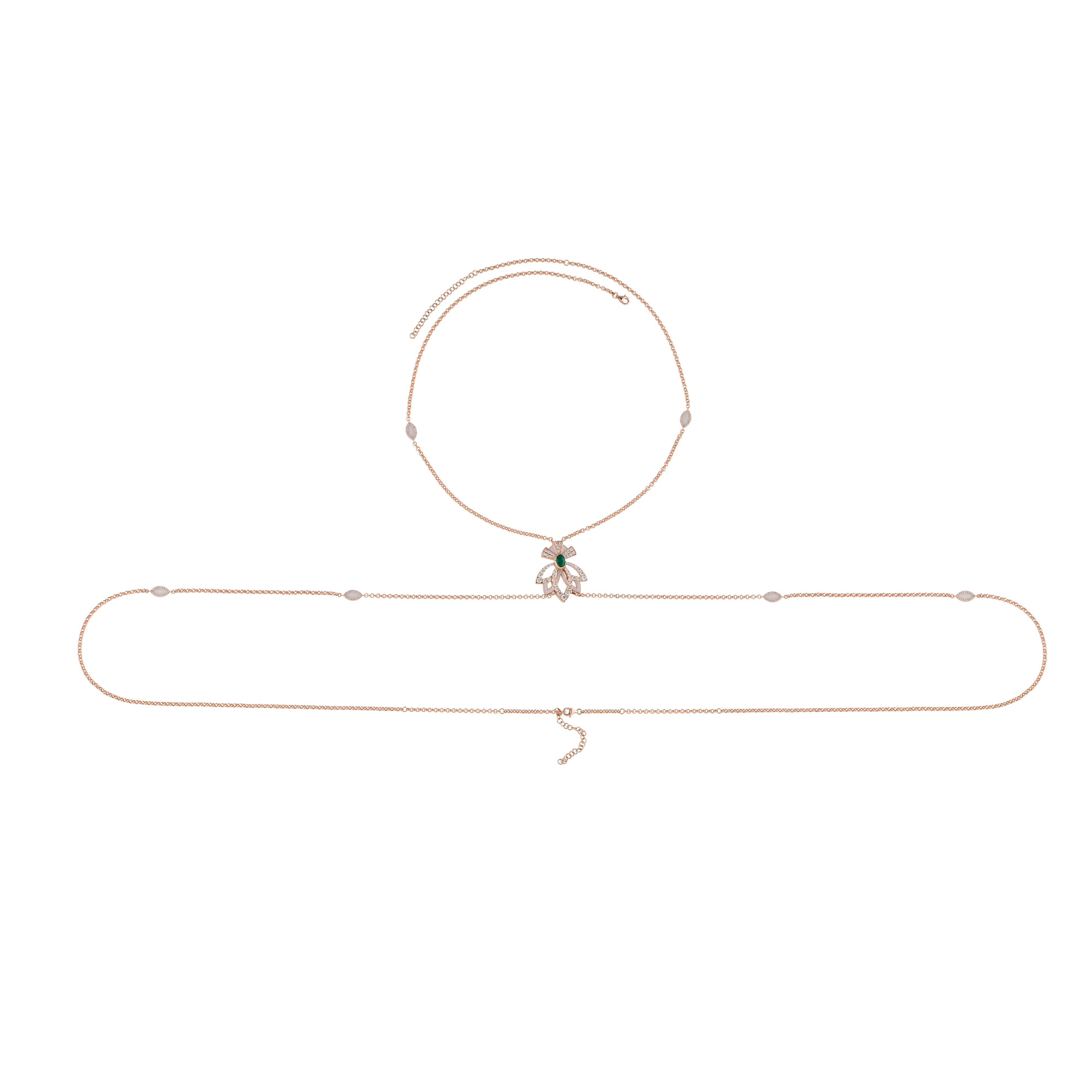 “Rising Lotus” vücut mücevheri, beyaz minenin zarif dokusu üzerine yerleştirilen zümrüt ve pırlantaların dengeli uyumuyla tasarlanmıştır.