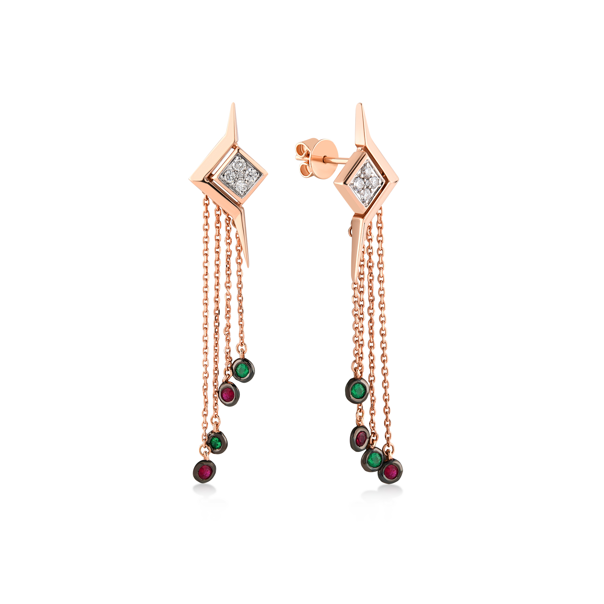 GOLD DANGLE EARRINGS WITH DIAMOND, RUBY AND EMERALD STONES - PENDULUM