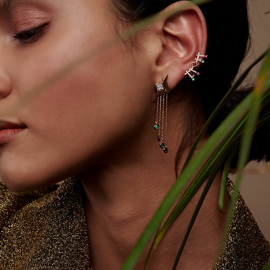 Symbolizing balance, Meri Krutzo's "Pendulum" earrings from the "Fulcrum" collection are designed with diamonds, rubies and emeralds.