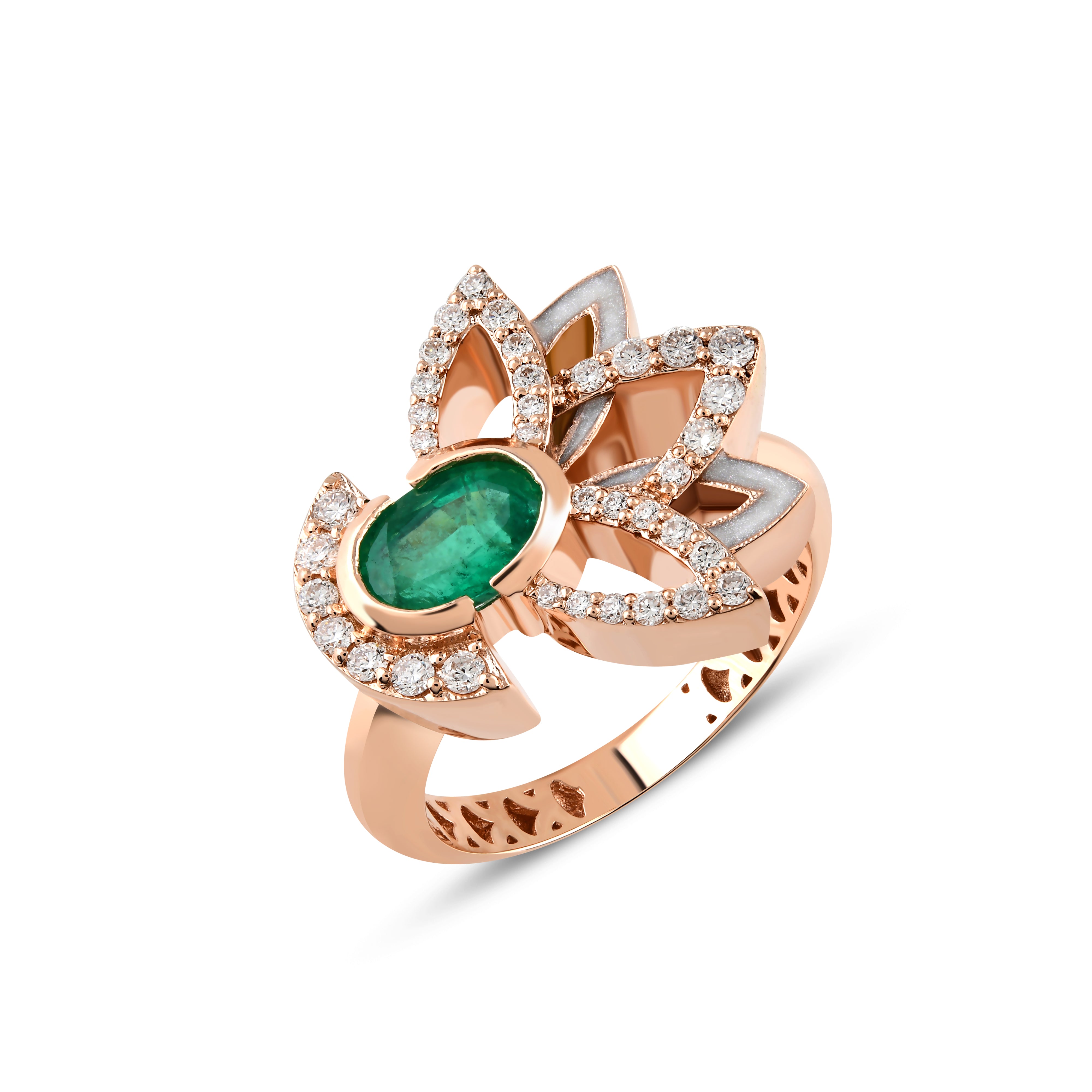 The “Rising Lotus” ring was designed with the harmony of emeralds and diamonds placed on the elegant texture of white enamel.