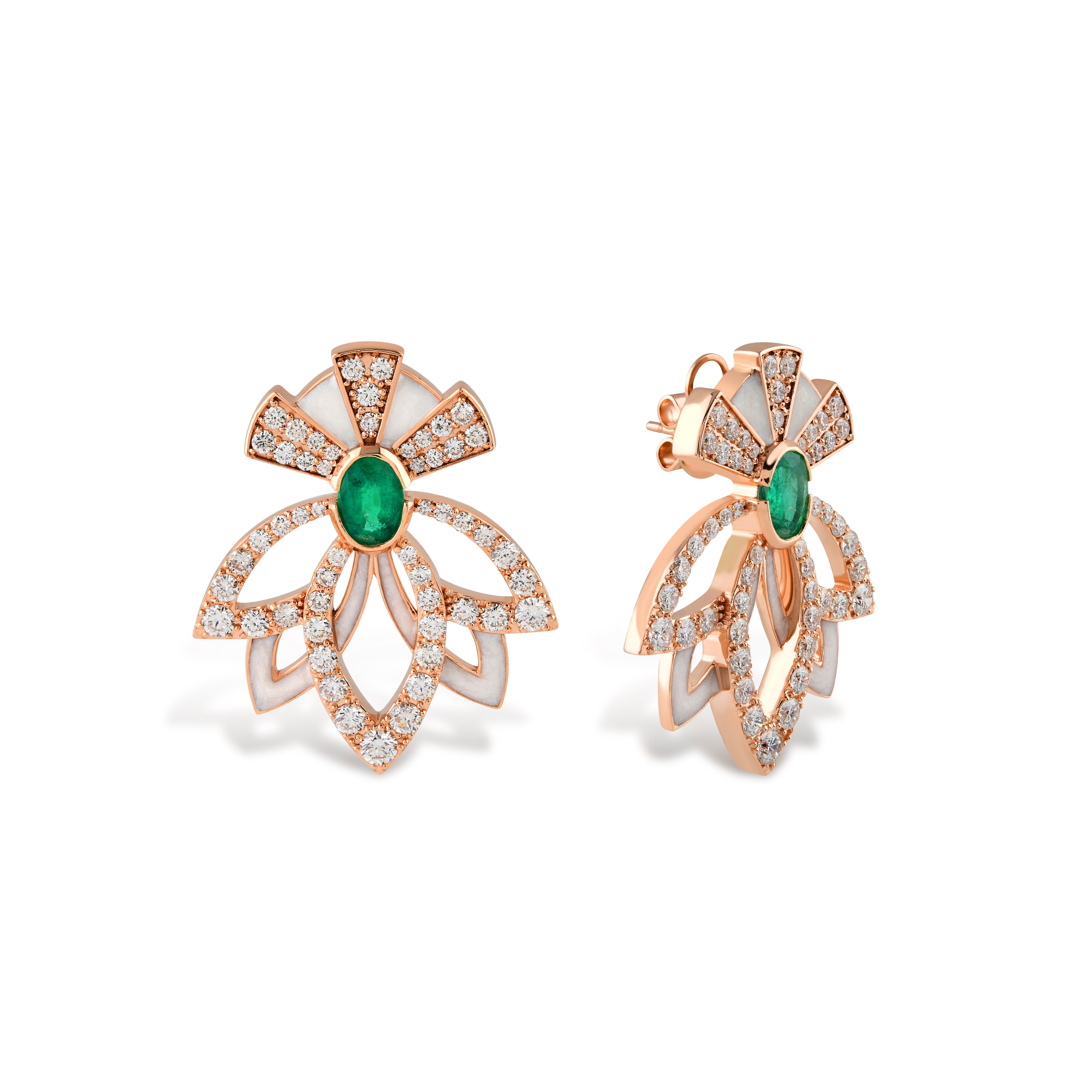 “Rising Lotus” earrings are designed with the balanced harmony of emerald and diamond stones placed on the elegant texture of white enamel.