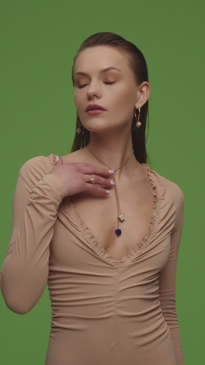 This dice form, which stands out with its bold, elegant line and meticulous workmanship, carries a modern interpretation with sapphire and lapis lazuli stones masterfully crafted. These pieces, which easily adapt to your daily style, reflect Meri Krutzo's signature character with its energetic and playful spirit.
