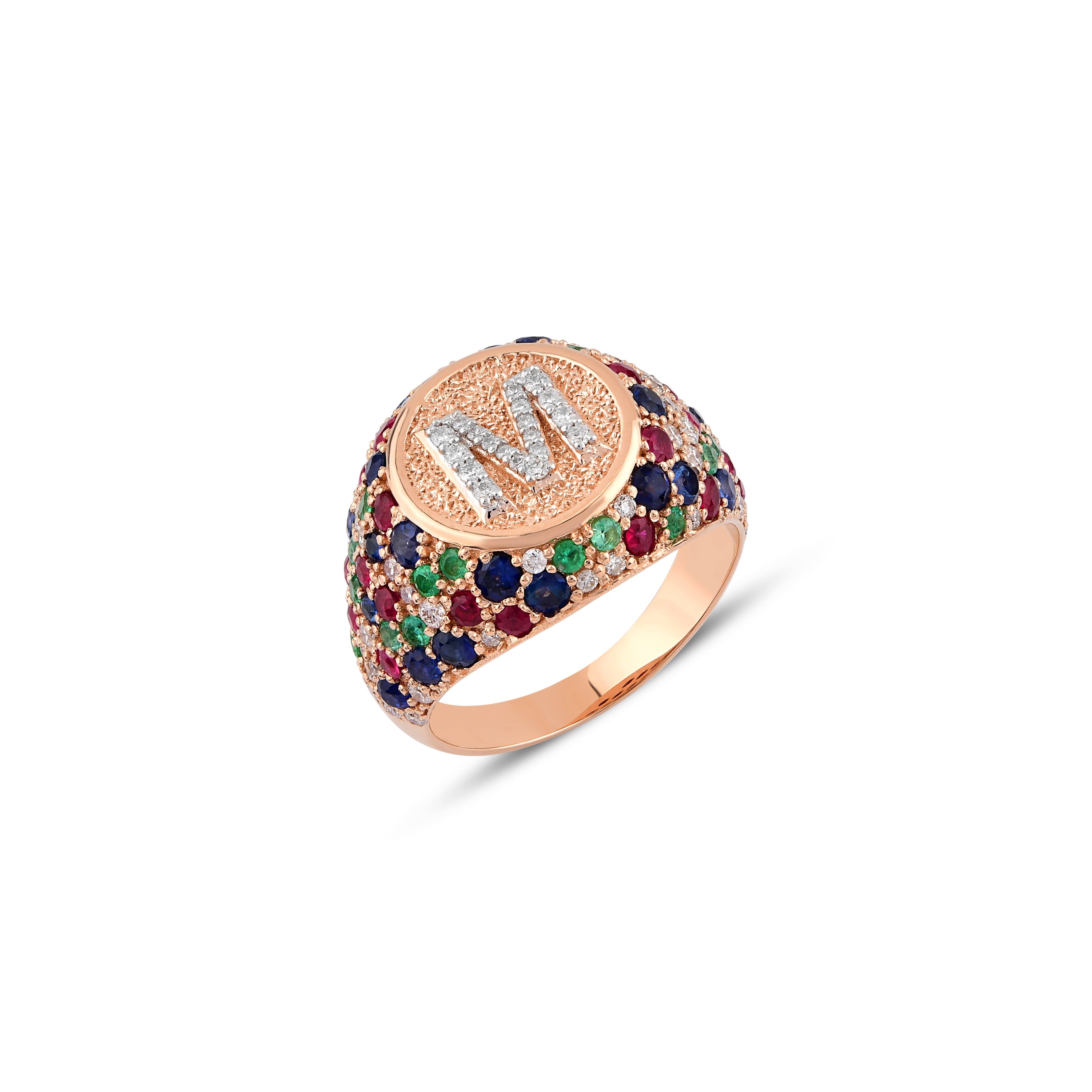 M LETTER GOLD RING WITH DIAMOND, SAPPHIRE, RUBY AND EMERALD STONES - SACRED COLLECTION