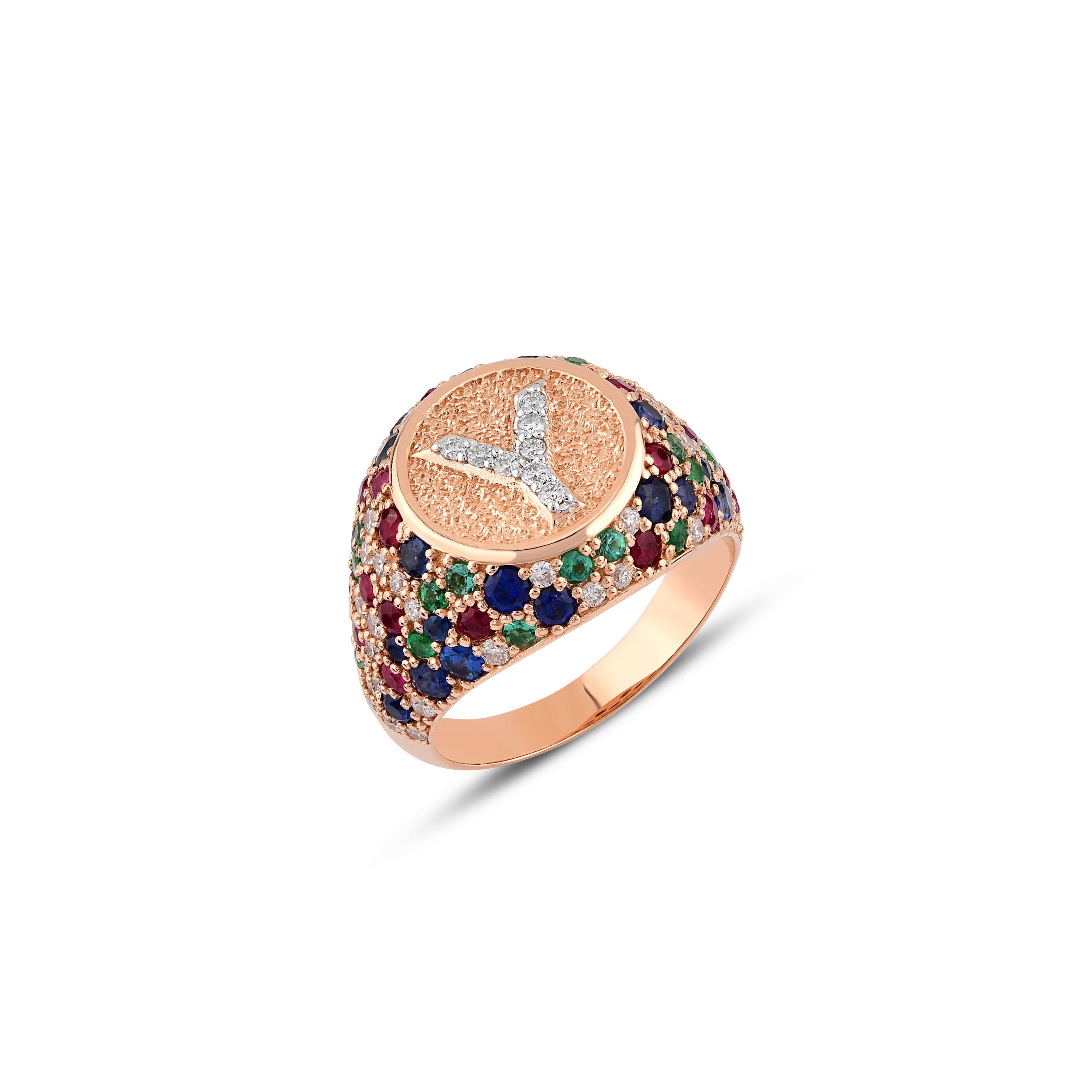 Y LETTER GOLD RING WITH DIAMOND, SAPPHIRE, RUBY AND EMERALD STONES - SACRED COLLECTION
