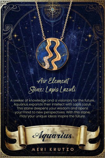 "Always seeking knowledge, with its free spirit, Aquarius is the guide of the future; Lapis Lazuli increases your intellectual depth, allowing your mind to open to new horizons. May this stone inspire your original ideas for the future..."
