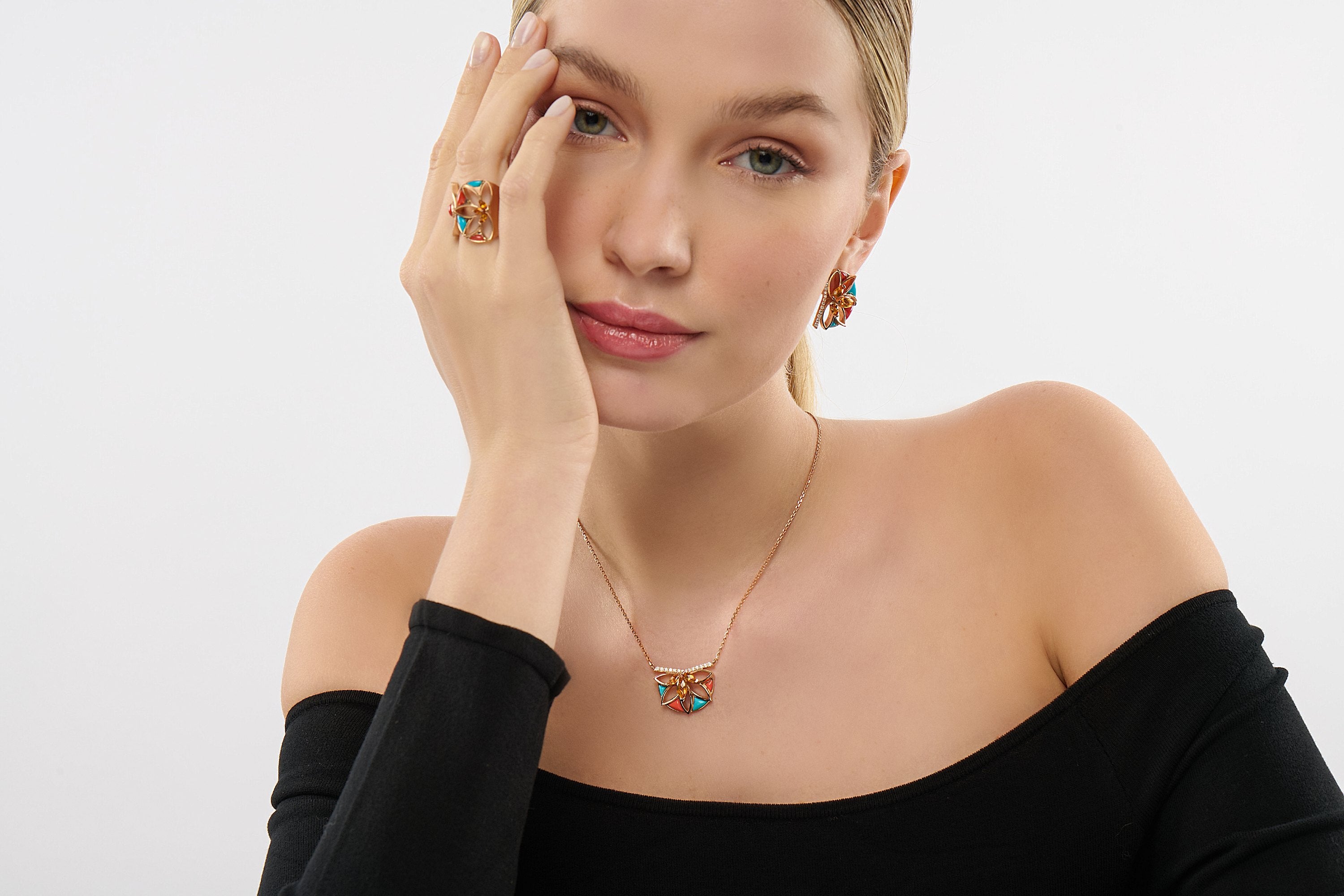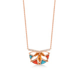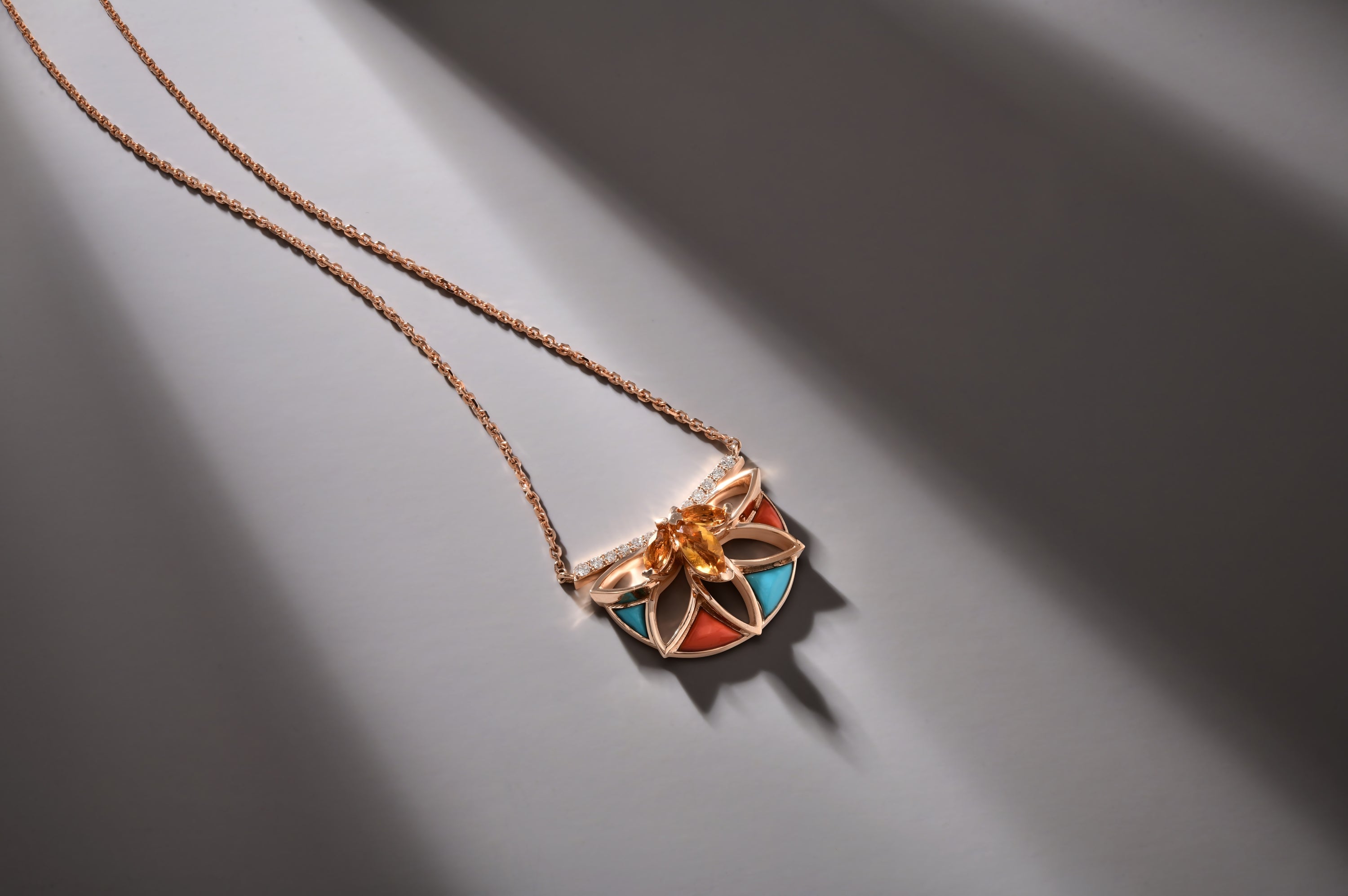 The “Blooming Lotus” necklace is designed by combining the warm energy of coral, the peaceful tones of turquoise and the vibrant light of citrine with the elegant shine of diamonds.