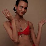 Earrings from Meri Krutzo's first designs, the "Lucky Lapis" collection, are made of lapis lazuli,