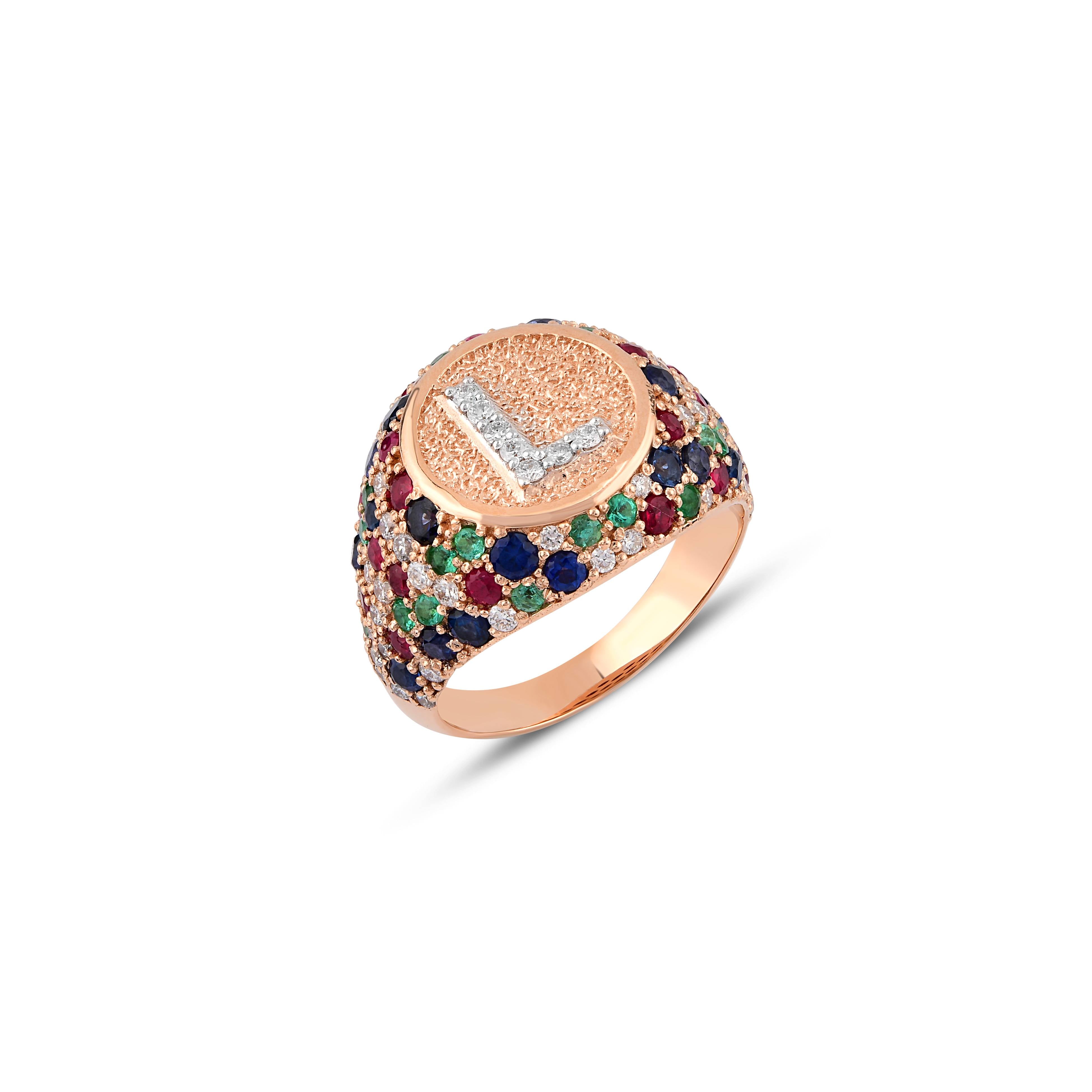 L LETTER GOLD RING WITH DIAMOND, SAPPHIRE, RUBY AND EMERALD STONES - SACRED COLLECTION