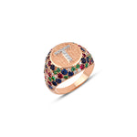 T LETTER GOLD RING WITH DIAMOND, SAPPHIRE, RUBY AND EMERALD STONES - SACRED COLLECTION