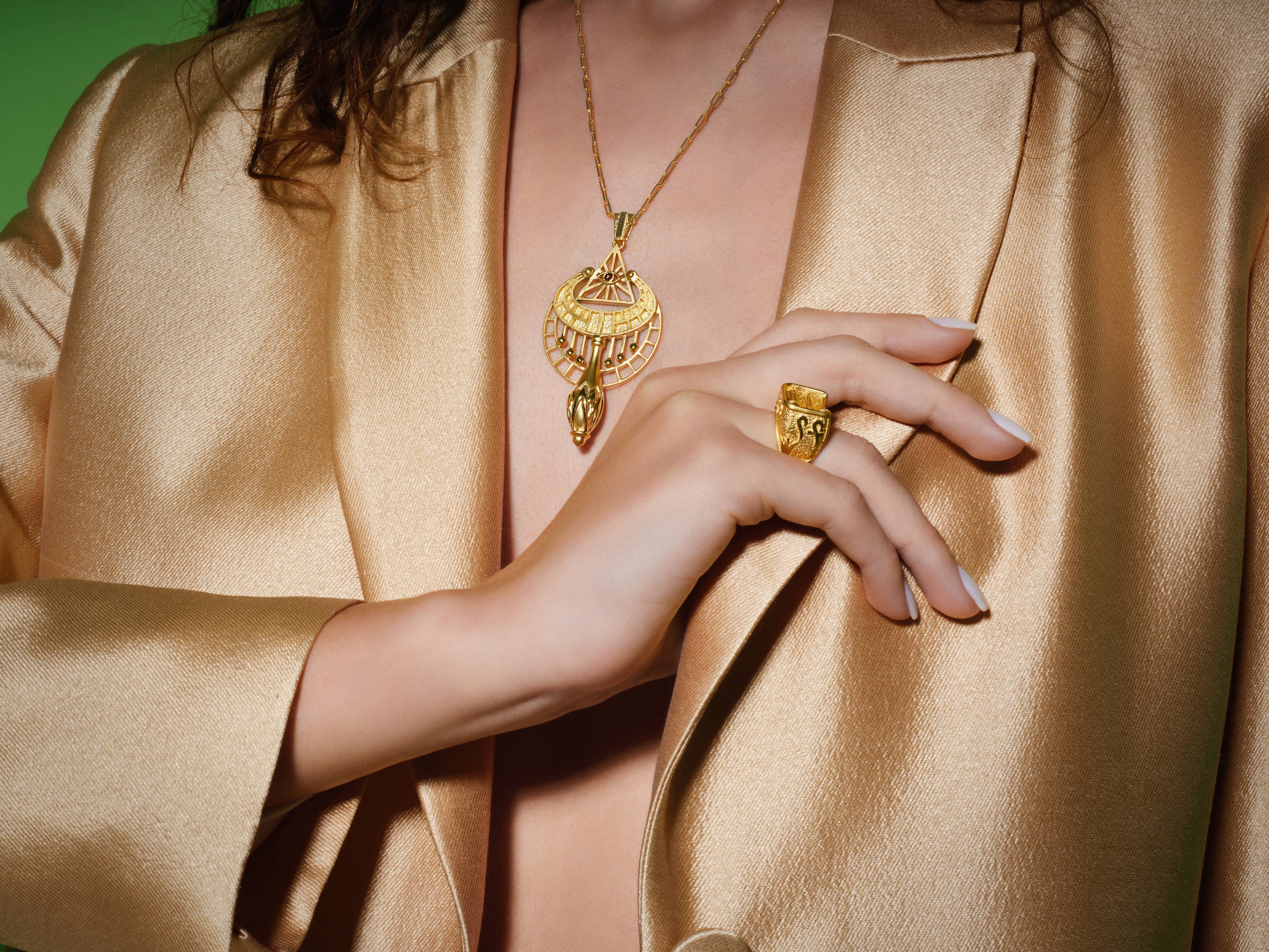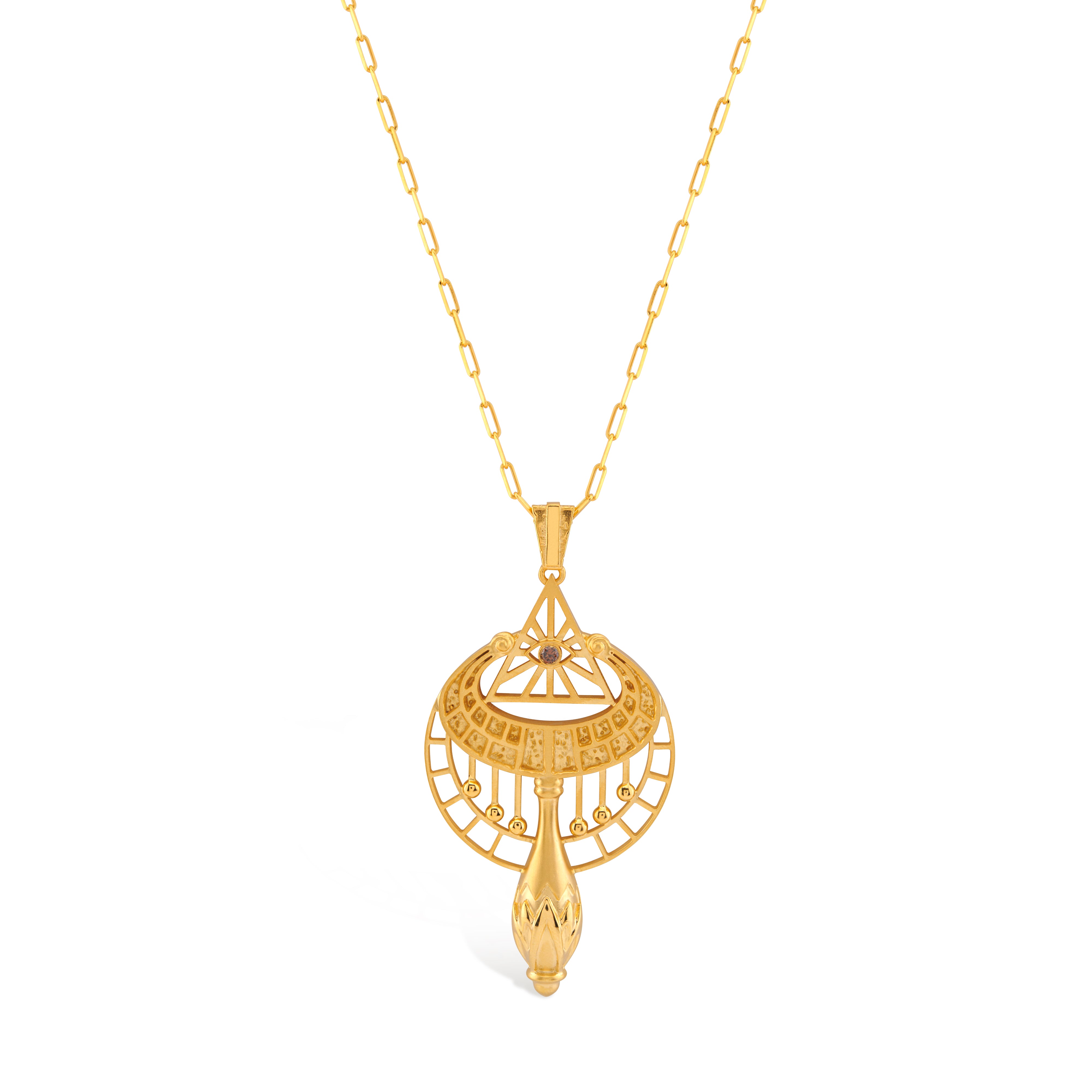Bu kolye, antik Mısır’da kutsal bir müzik aleti olarak bilinen sistrumdan ilham alır.Kolye ucundaki zarif çubuklar ve boncuklar, sistrumun ritmik titreşimlerini ve yaşamın kutsal armonisini simgeler.Merkezde yer alan göz formu, tanrıça İsis ile Osiris’in oğlu Horus’un “üçüncü gözü”nden esinlenmiştir.Bilgelik,sezgi ve ilahi korumayı temsil eder.