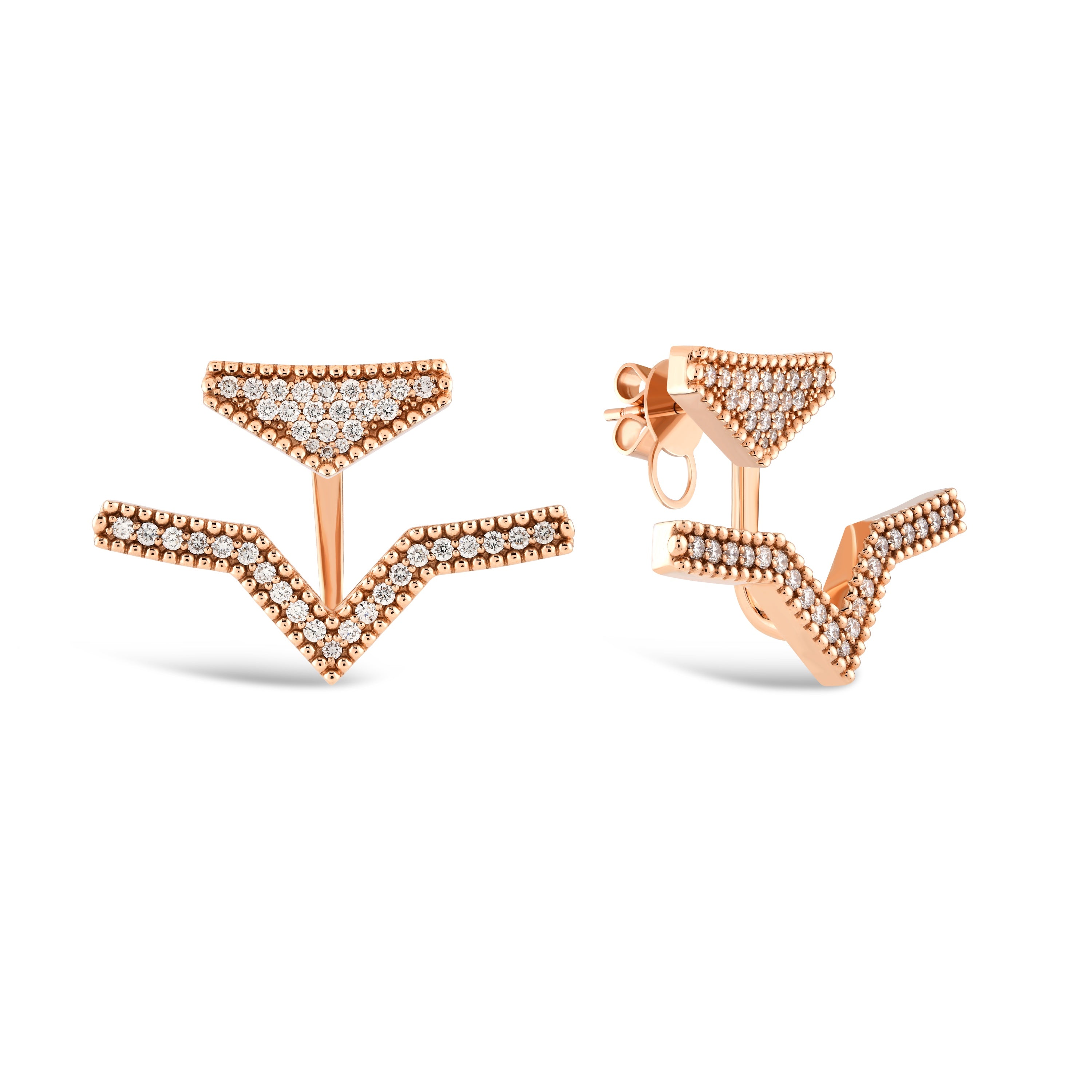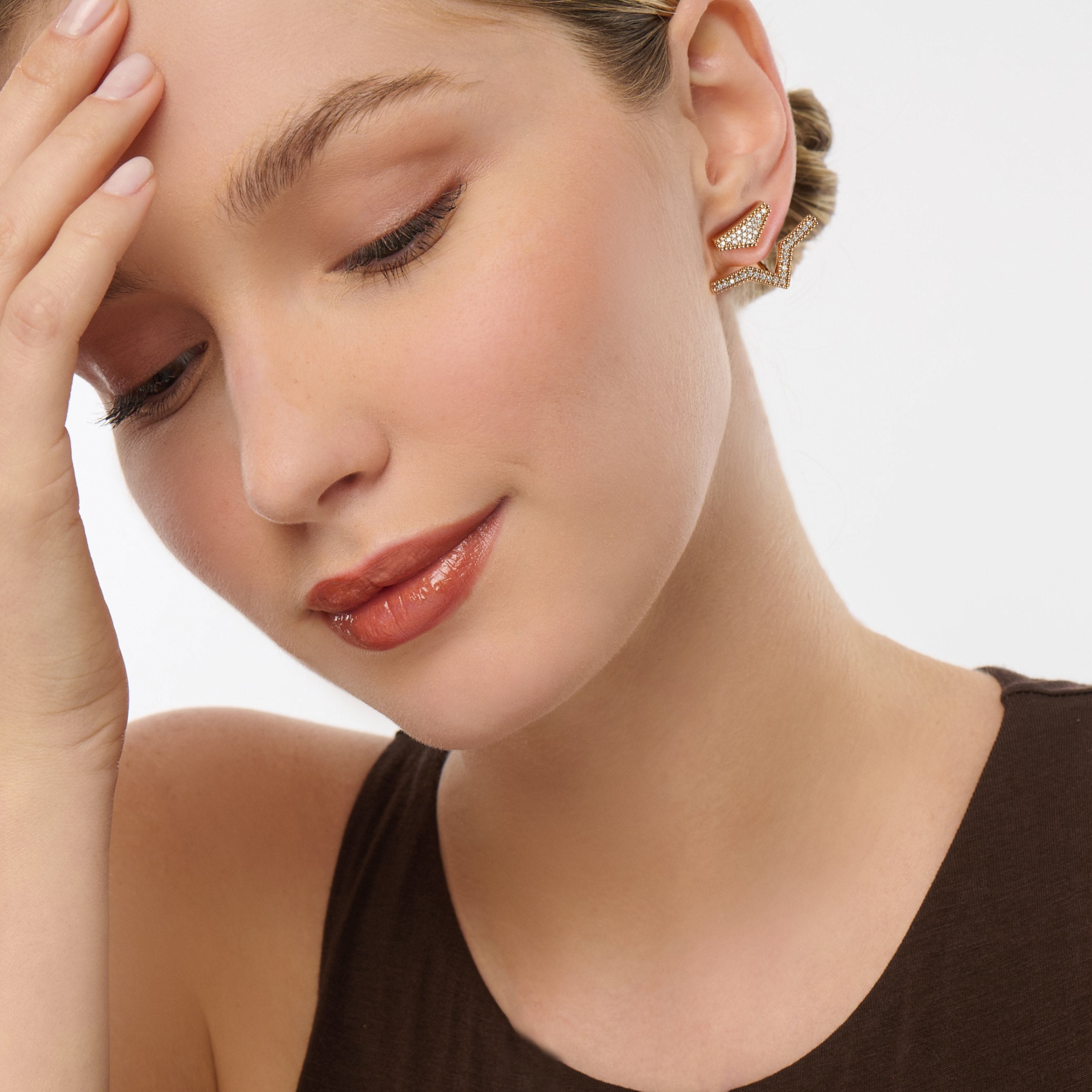 Dengeyi sembolize eden Meri Krutzo “Fulcrum” koleksiyonundan “Dazzling Fulcrum” küpeler, ışığın zarafetle buluştuğu anı yansıtıyor.Pırlantaların ışıltısı, gücü, geometrik formu, dengeyi ve zarif bir duruşu bir araya getiriyor.